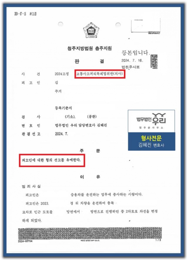 오늘은 청주지방법원 충주지원 2024고정** 교통사고처리특례법위반(치사) 사건에 대해 소개해 드립니다.